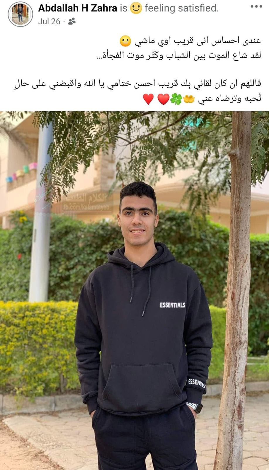 وتابع: فاللهم إن كان لقائي بك قريبا فأحسن ختامي يا الله واقبضني على حال تحبه وترضاه عني، وسادت حالة من الحزن بين أصدقاء الشاب عبد الله بعد وفاته التي صدمتهم، خاصة بعدما رأوا المنشور الذي يتنبأ فيه بوفاته.